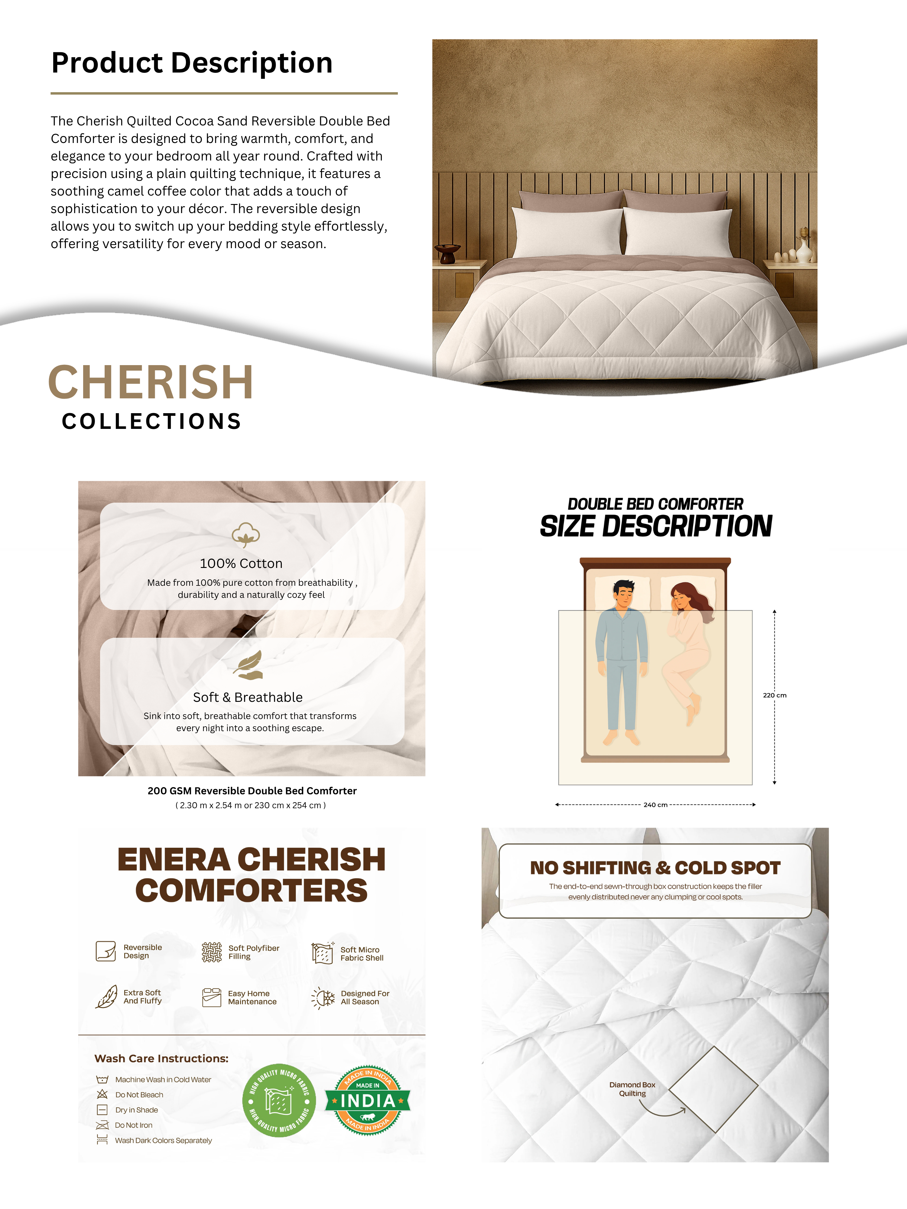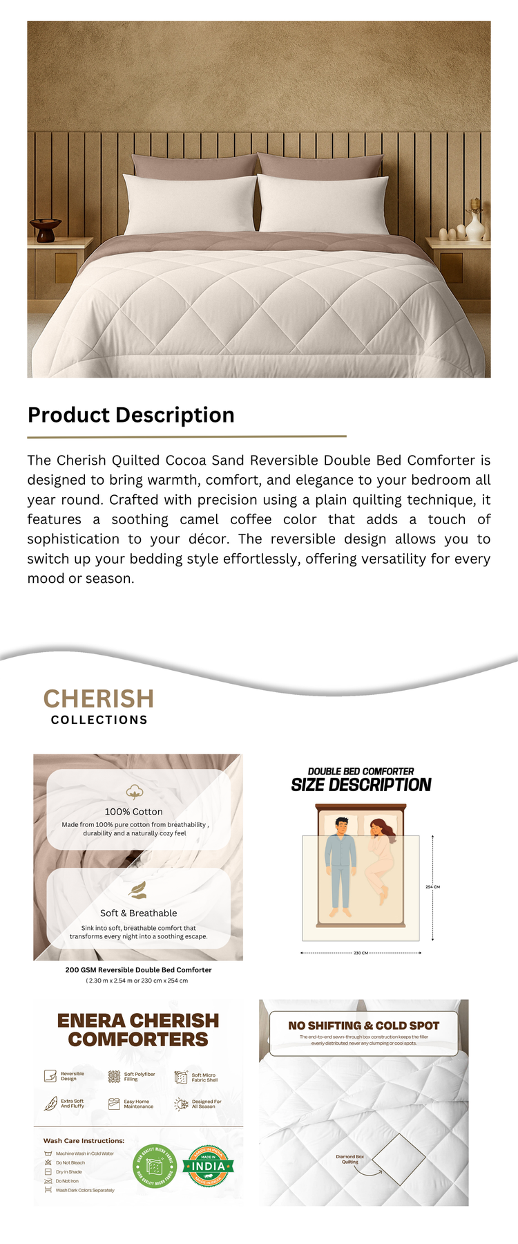 The Cherish Quilted Cocoa Sand Reversible Double Bed Comforter is designed to bring warmth, comfort, and elegance to your bedroom all year round. Crafted with precision using a plain quilting technique, it features a soothing camel coffee color that adds a touch of sophistication to your décor. The reversible design allows you to switch up your bedding style effortlessly, offering versatility for every mood or season. Measuring 230 cm x 254 cm, this double bed comforter provides full coverage and coziness, making it perfect for restful sleep during both cool and warm nights. Soft, durable, and easy to maintain, it’s an ideal choice for everyday comfort.