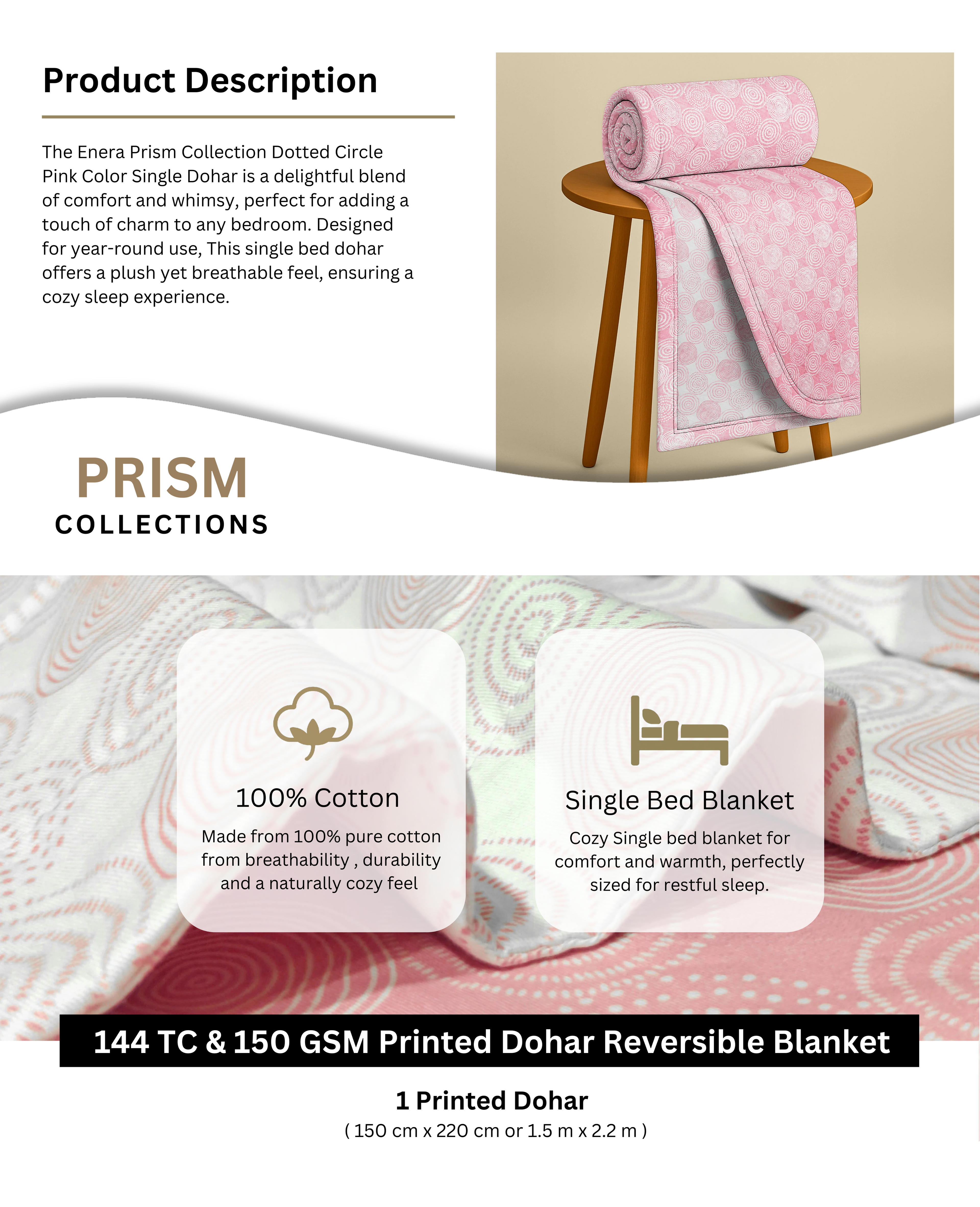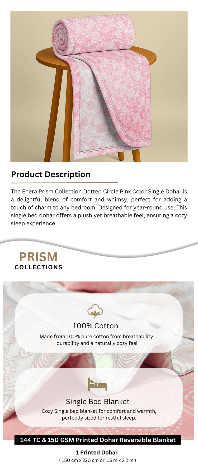 The Enera Prism Collection Dotted Circle Pink Color Single Dohar is a delightful blend of comfort and whimsy, perfect for adding a touch of charm to any bedroom. Designed for year-round use, This single bed dohar offers a plush yet breathable feel, ensuring a cozy sleep experience.