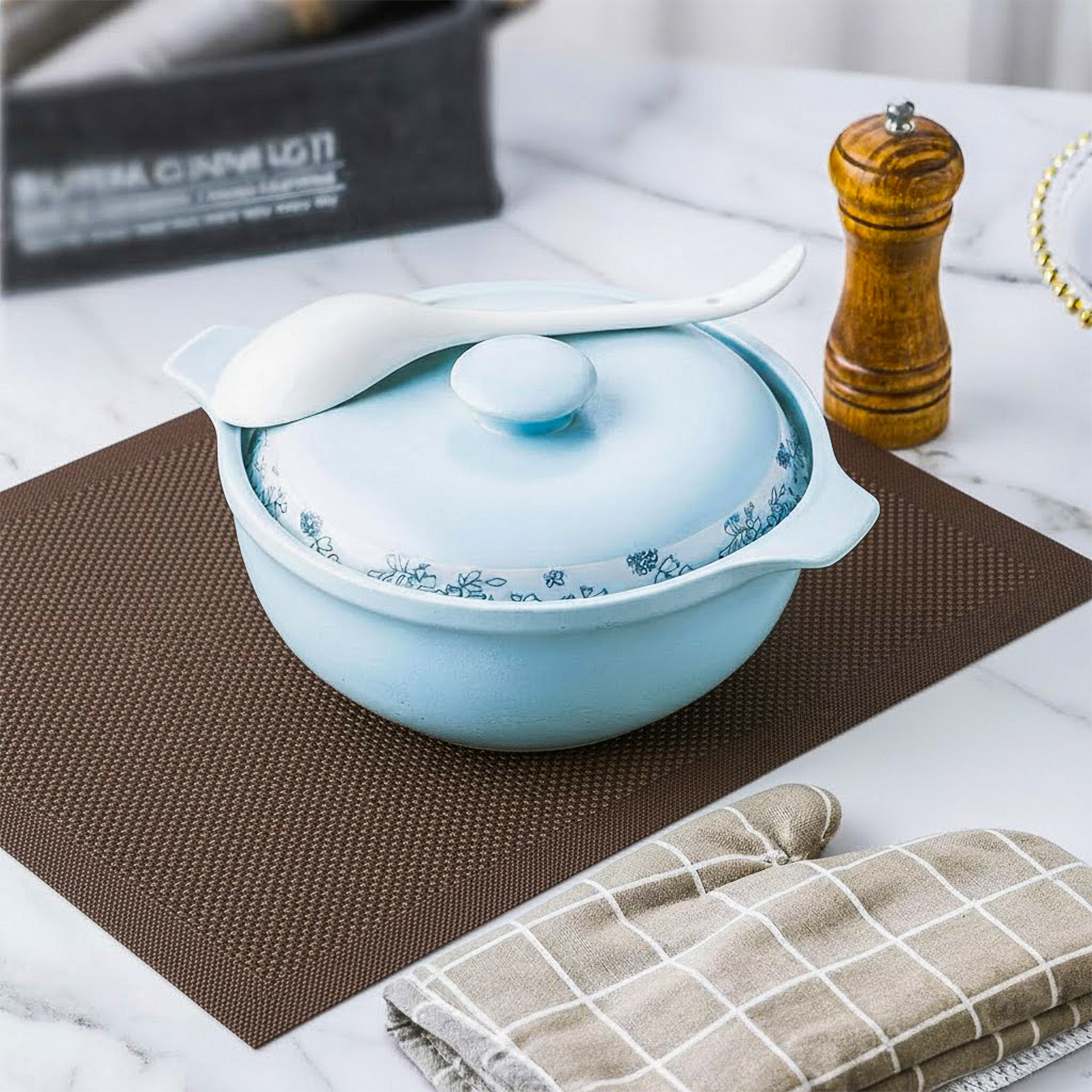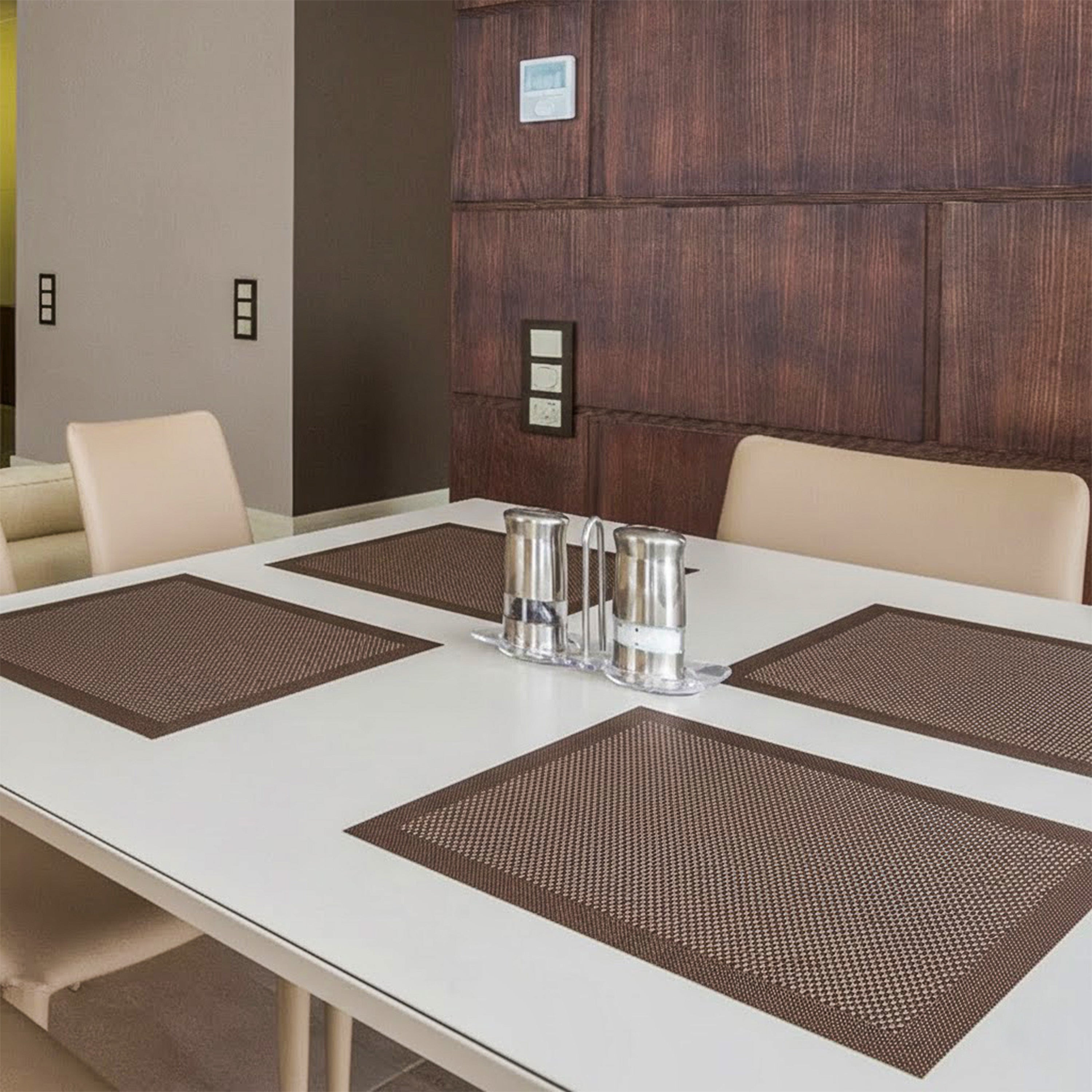Enhance your dining experience with this set of six woven PVC check table mats in a stylish choco black design. Crafted from durable and easy-to-clean PVC, these mats provide excellent protection for your table against spills, stains, and heat. The rectangular shape, measuring 30 cm by 45 cm with a 1 cm thickness, fits most standard dining tables and adds a touch of modern elegance to any setting. The woven pattern not only enhances the aesthetic appeal but also adds texture and sophistication to your dining space. Lightweight yet sturdy, these mats are easy to handle, store, and clean, making them ideal for everyday use as well as special occasions. Resistant to moisture and heat, they maintain their shape and look even after prolonged use. Perfect for homes, restaurants, or cafes, this pack of six ensures uniformity across your table, bringing a cohesive and stylish look to your dining area while offering practical functionality.