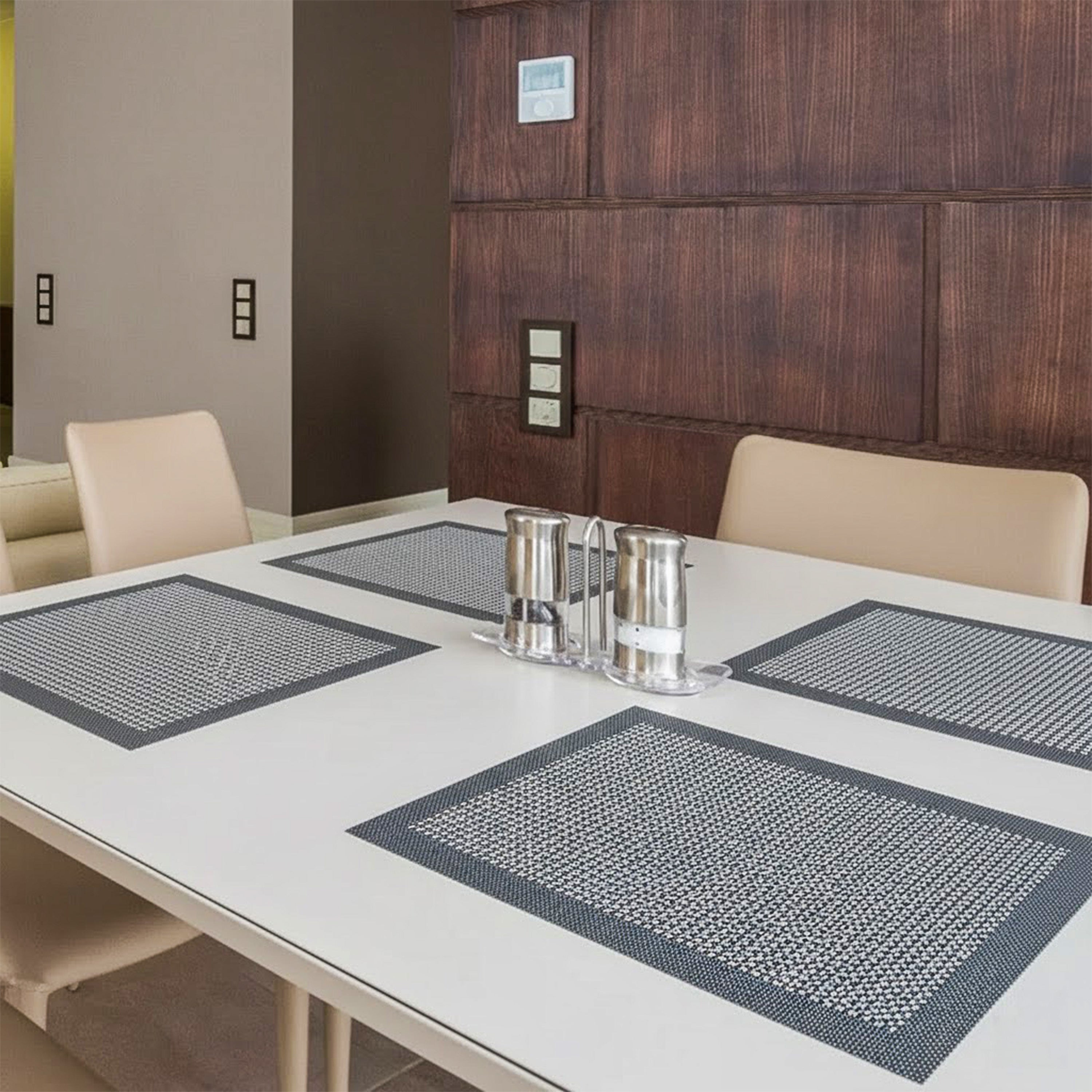 Enhance your dining experience with this Woven PVC Check Table Mat in Silver Black, designed to bring both style and functionality to your table. Crafted from high-quality PVC, these mats are durable, easy to clean, and resistant to spills, making them perfect for everyday use or special occasions. The sleek silver and black check pattern adds a contemporary touch, complementing a variety of table settings and home décor styles. Each rectangular mat measures 30 cm x 45 cm x 1 cm, providing ample space to protect your table from scratches, stains, and heat damage. The set comes in a pack of six, offering a coordinated and polished look for family meals or gatherings with friends. Lightweight yet sturdy, these mats are simple to place, remove, and clean. Their woven design not only enhances aesthetics but also ensures long-lasting durability, making them a practical and stylish addition to any dining space.