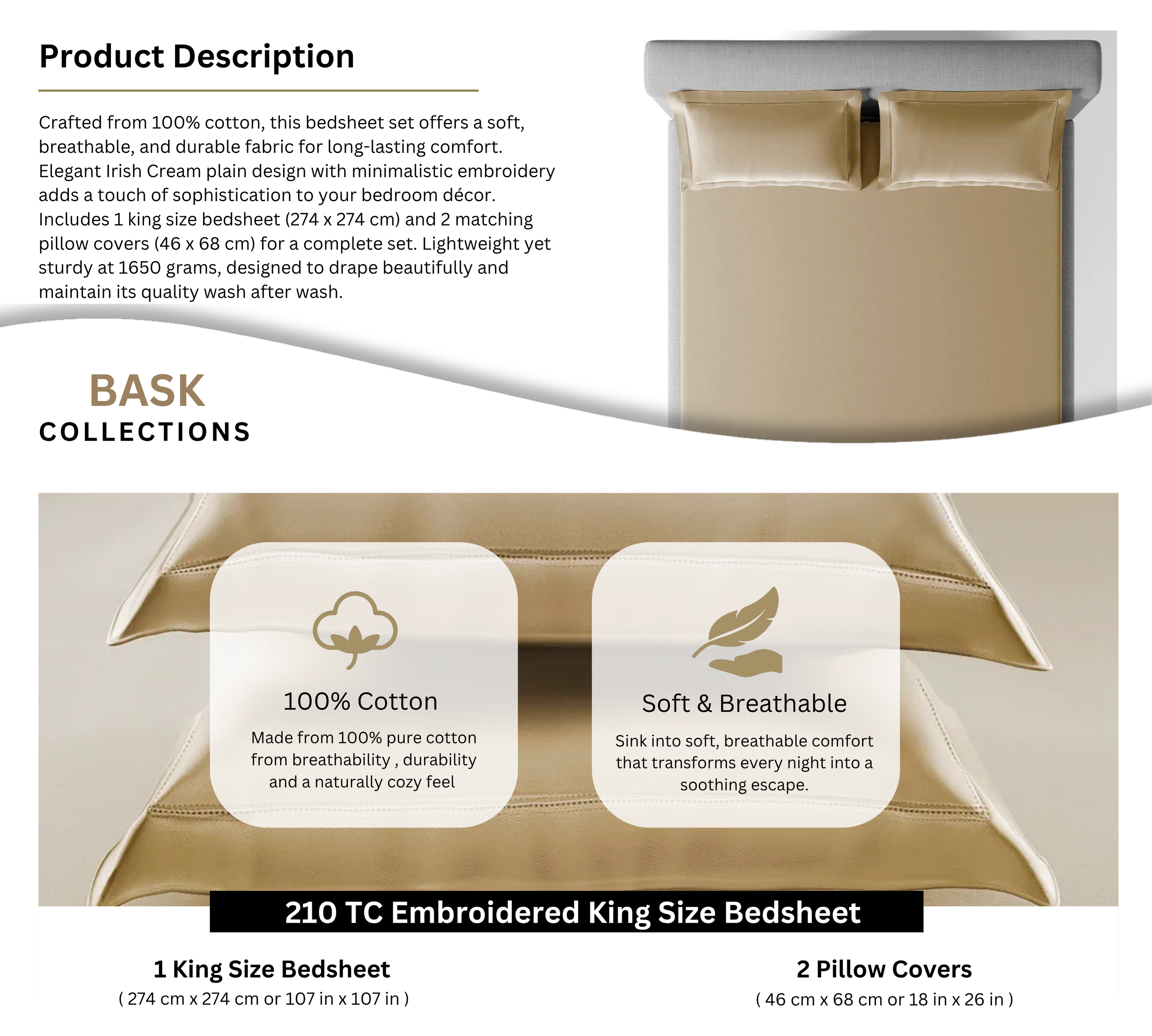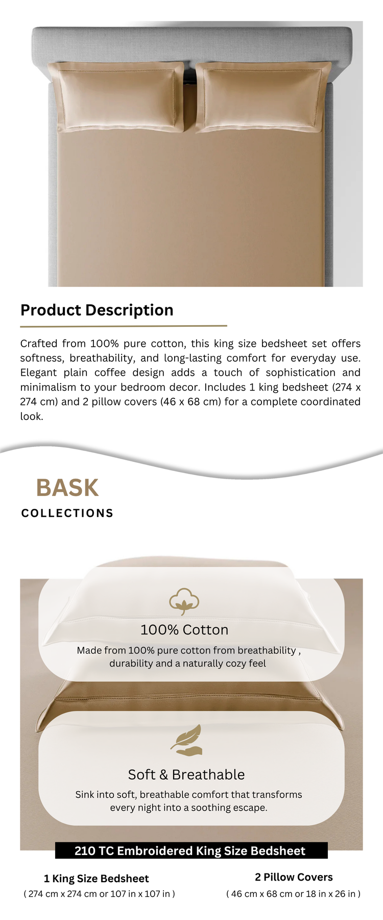 Includes 1 king size bedsheet (274 x 274 cm) and 2 matching pillow covers (46 x 68 cm) for a complete set.