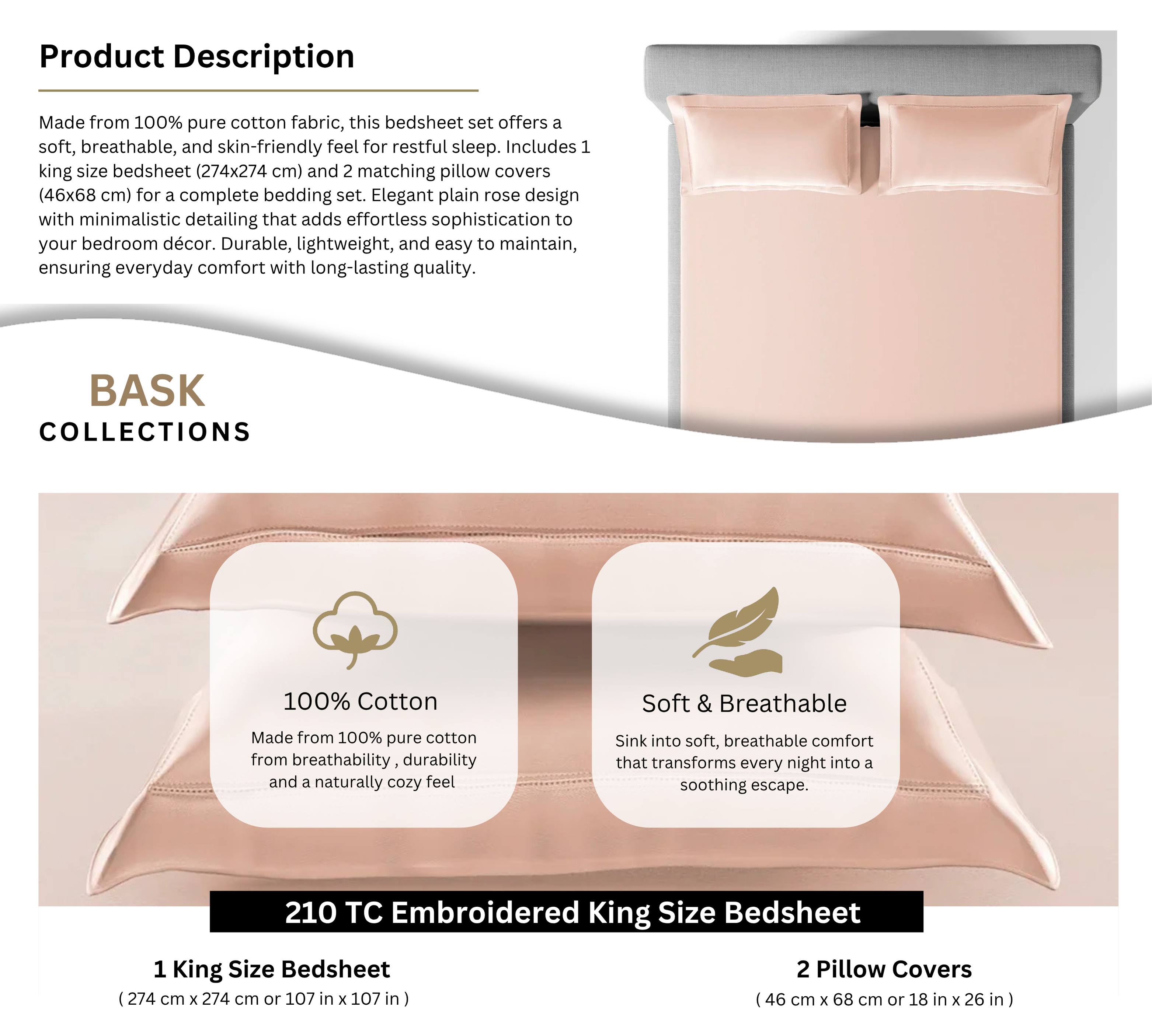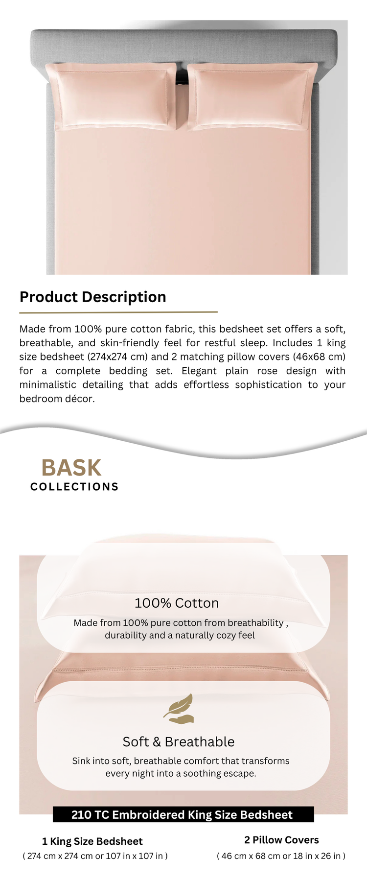 Includes 1 king size bedsheet (274x274 cm) and 2 matching pillow covers (46x68 cm) for a complete bedding set.