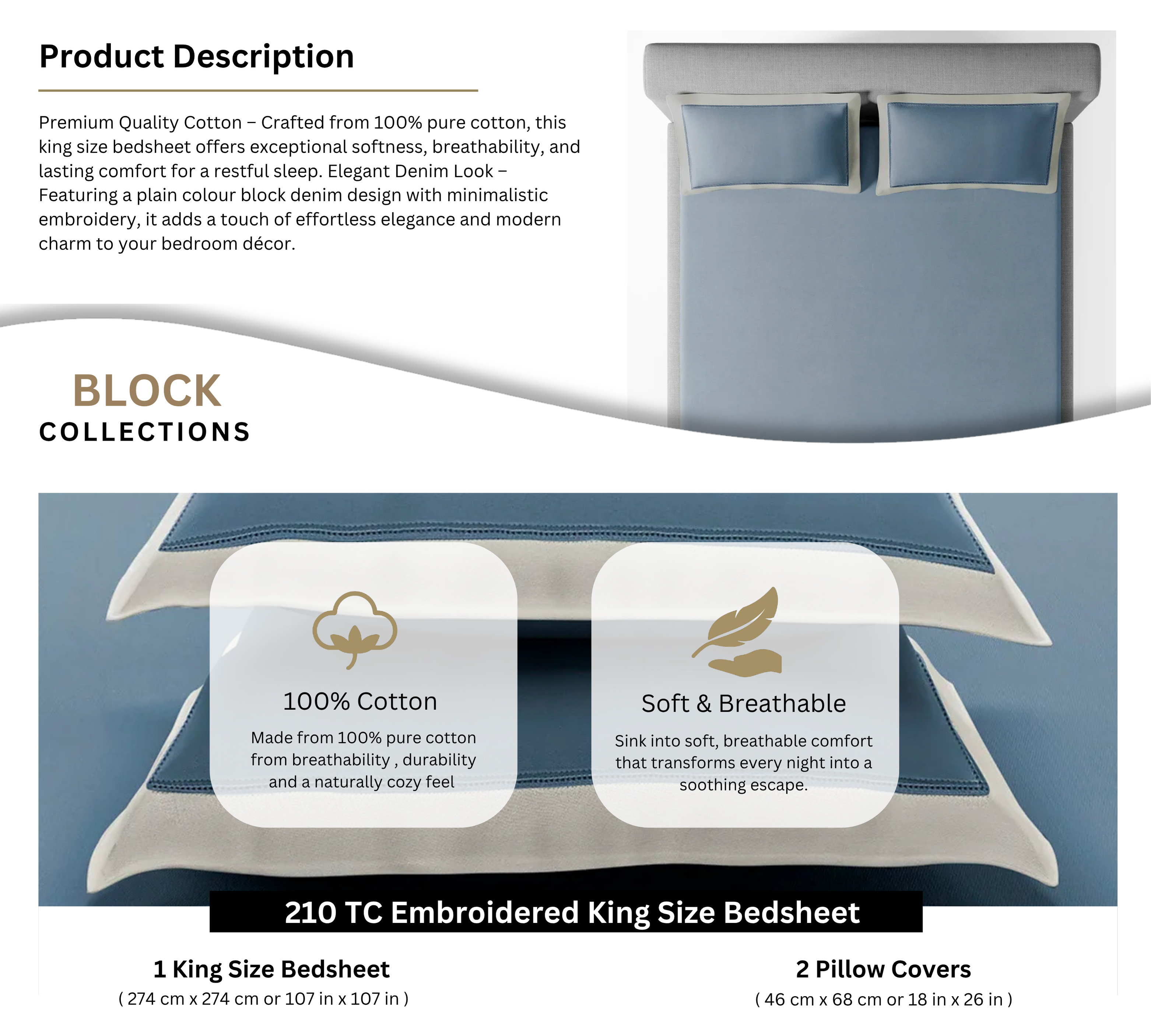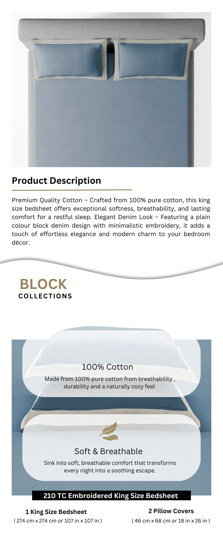 • Elegant Denim Look – Featuring a plain colour block denim design with minimalistic embroidery, it adds a touch of effortless elegance and modern charm to your bedroom décor.