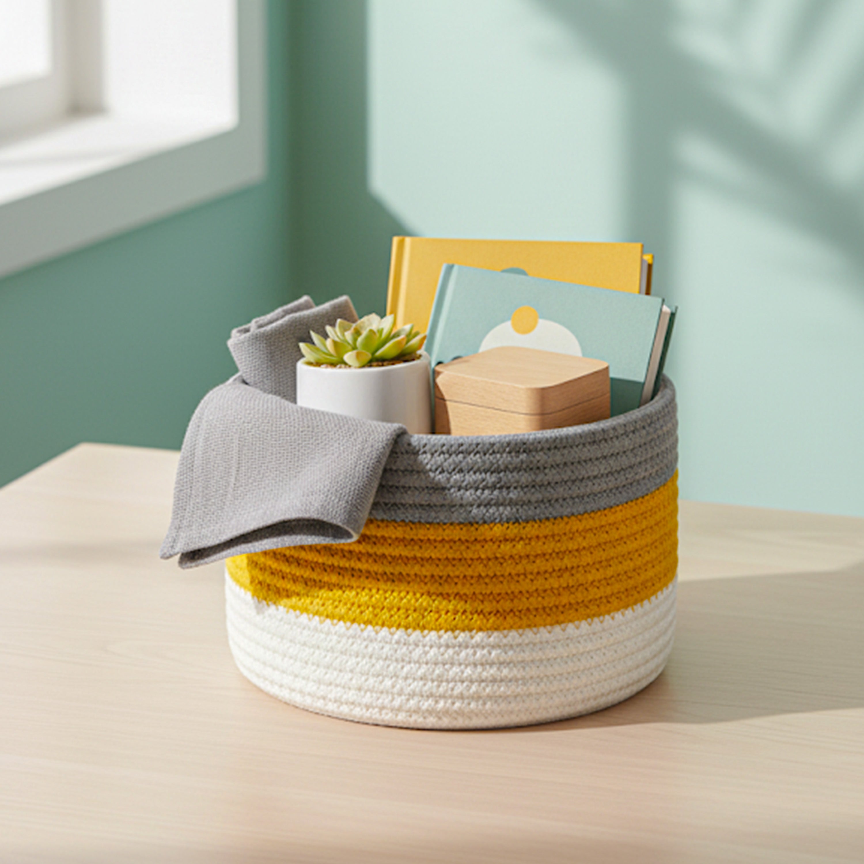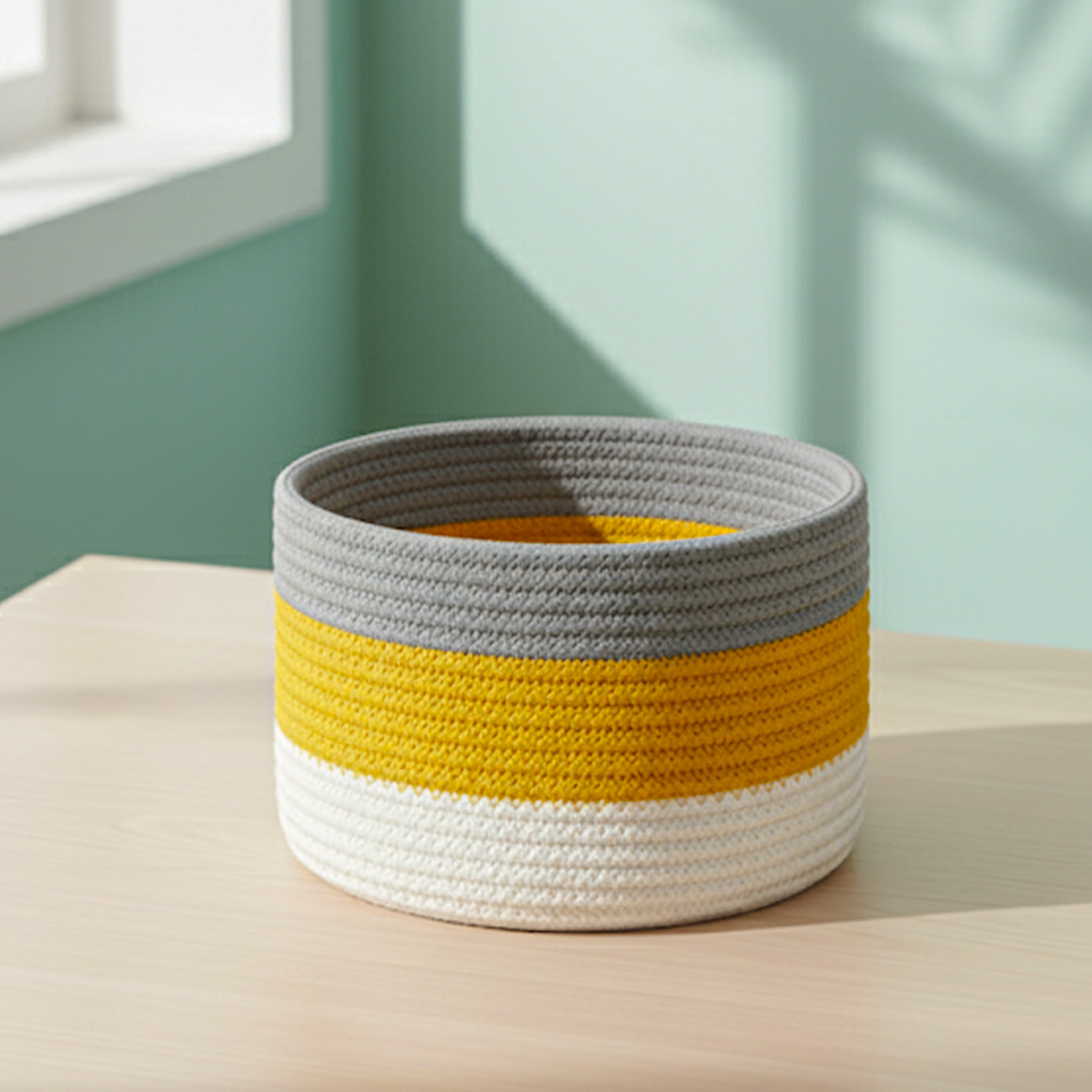 Braided Cotton Storage Basket with Lid & Handle | Grey & Yellow | Multipurpose Organizer (1pc)