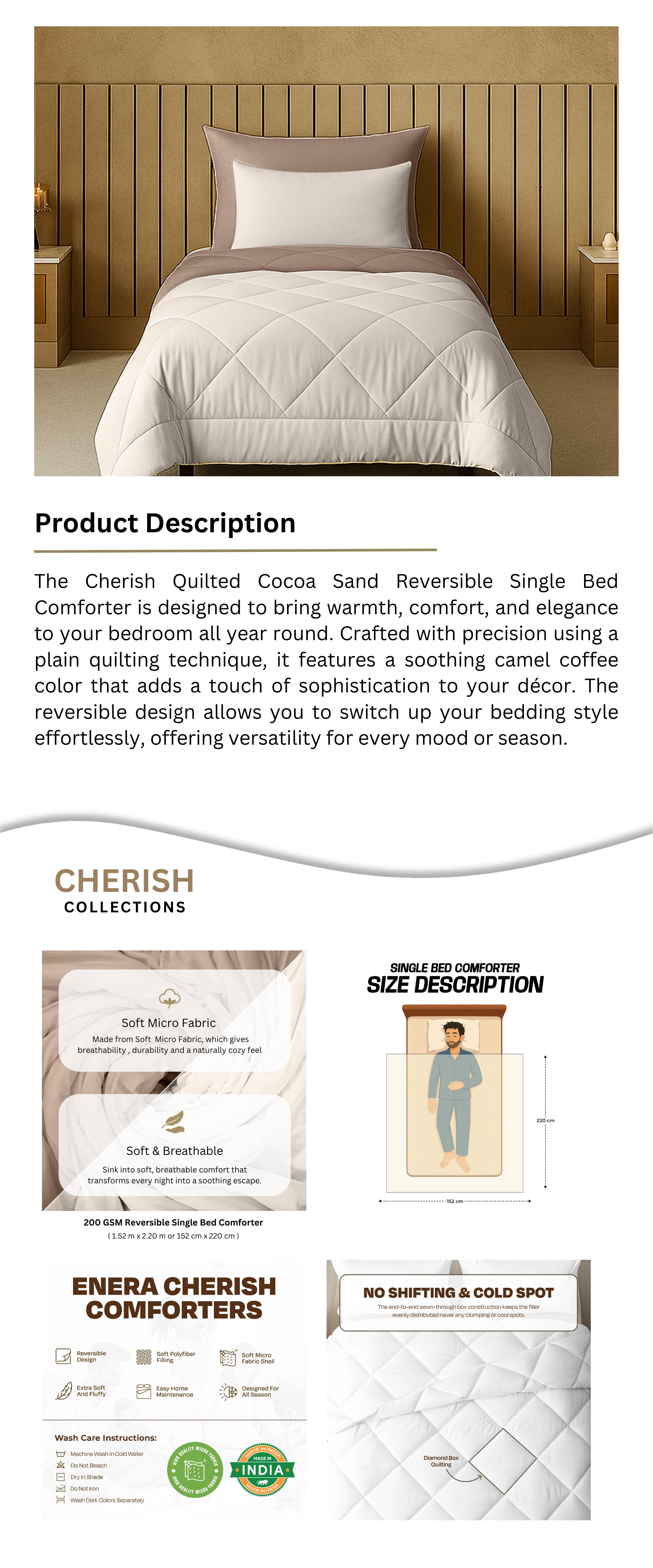 The Cherish Quilted Cocoa Sand Reversible Single Bed Comforter is designed to bring warmth, comfort, and elegance to your bedroom all year round. Crafted with precision using a plain quilting technique, it features a soothing camel coffee color that adds a touch of sophistication to your décor. The reversible design allows you to switch up your bedding style effortlessly, offering versatility for every mood or season. Measuring 230 cm x 254 cm, this double bed comforter provides full coverage and coziness, making it perfect for restful sleep during both cool and warm nights. Soft, durable, and easy to maintain, it’s an ideal choice for everyday comfort.