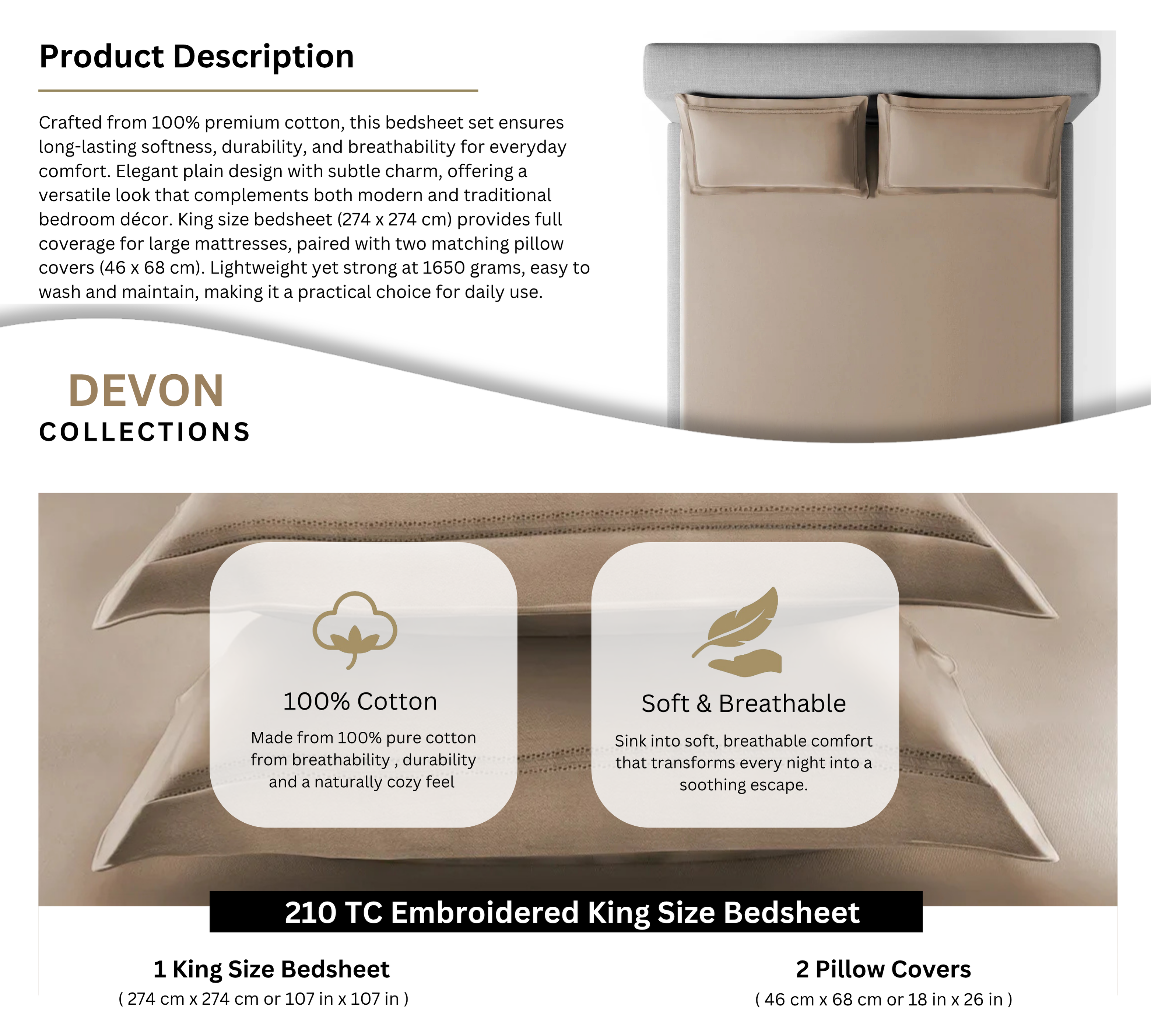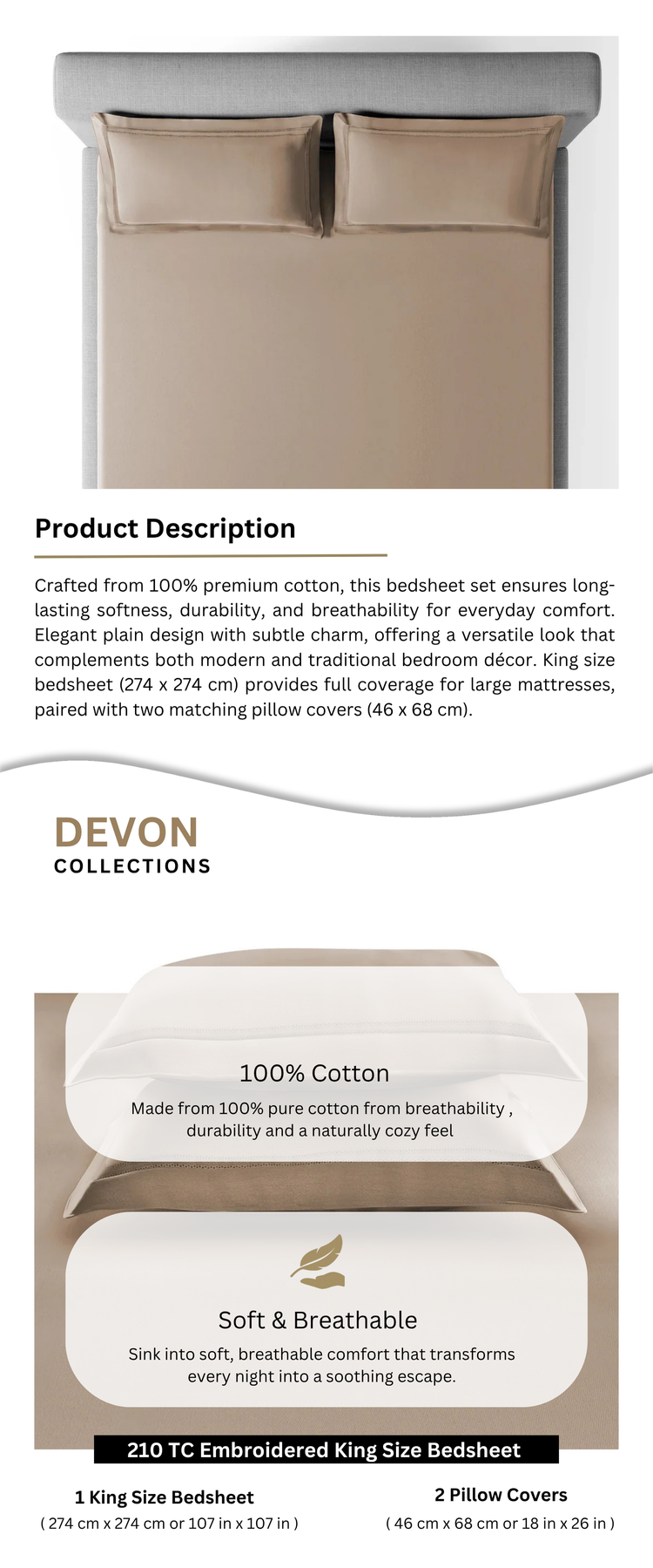 • King size bedsheet (274 x 274 cm) provides full coverage for large mattresses, paired with two matching pillow covers (46 x 68 cm).
