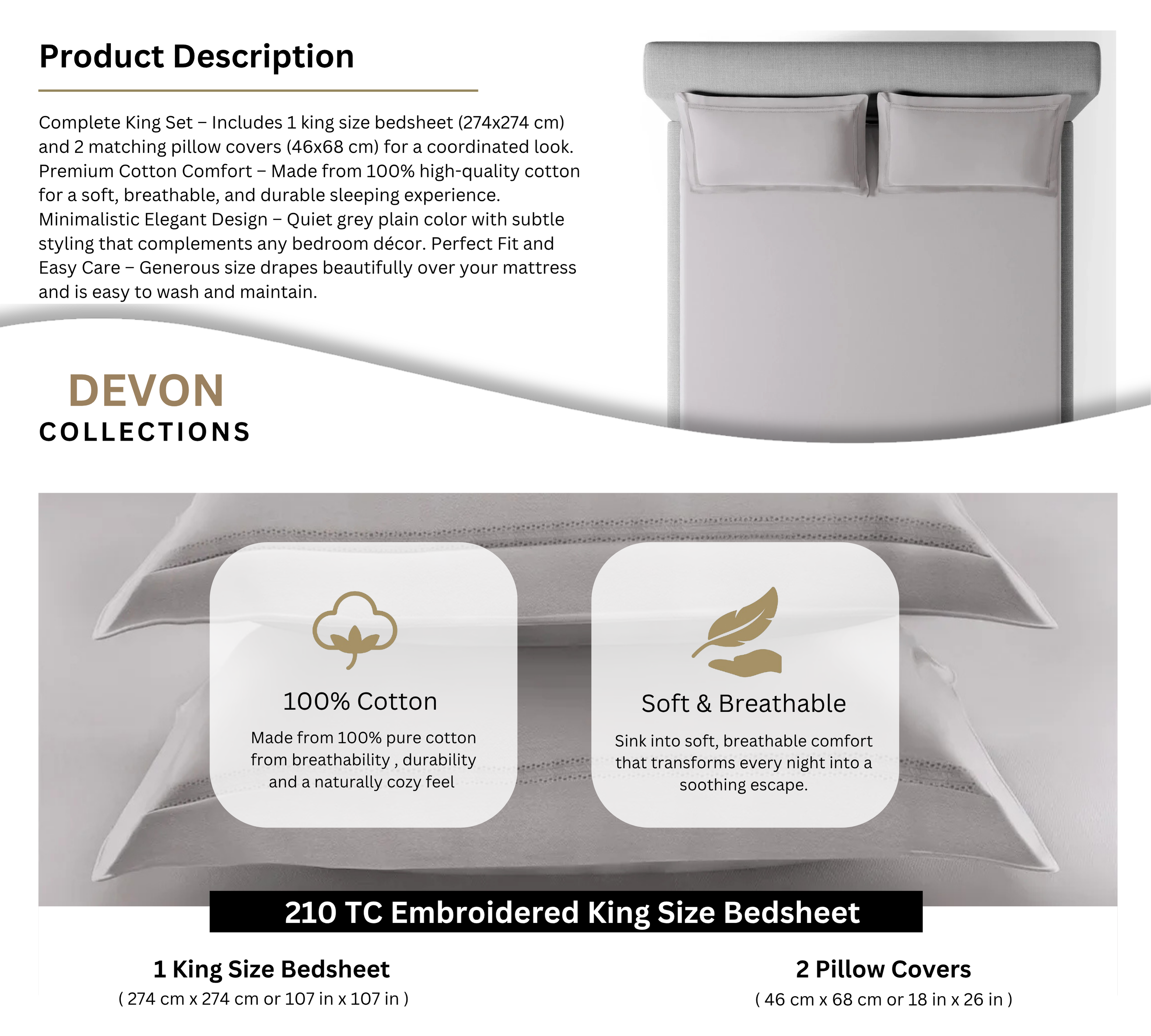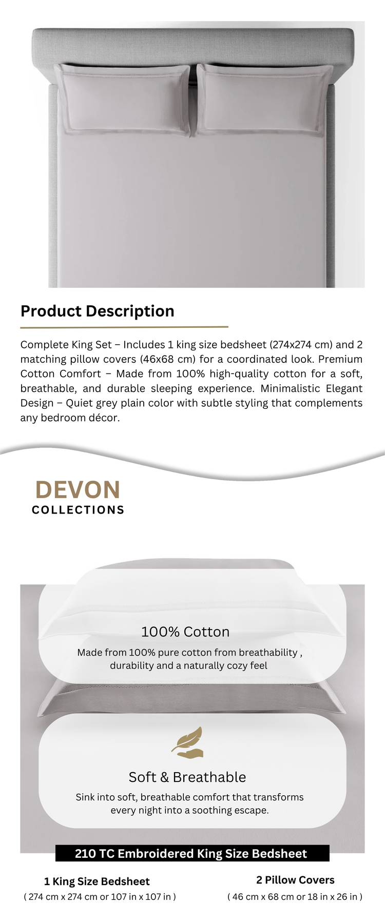 Devon Quiet Grey 100% Cotton King Size Bedsheet Set with 2 Pillow Covers
