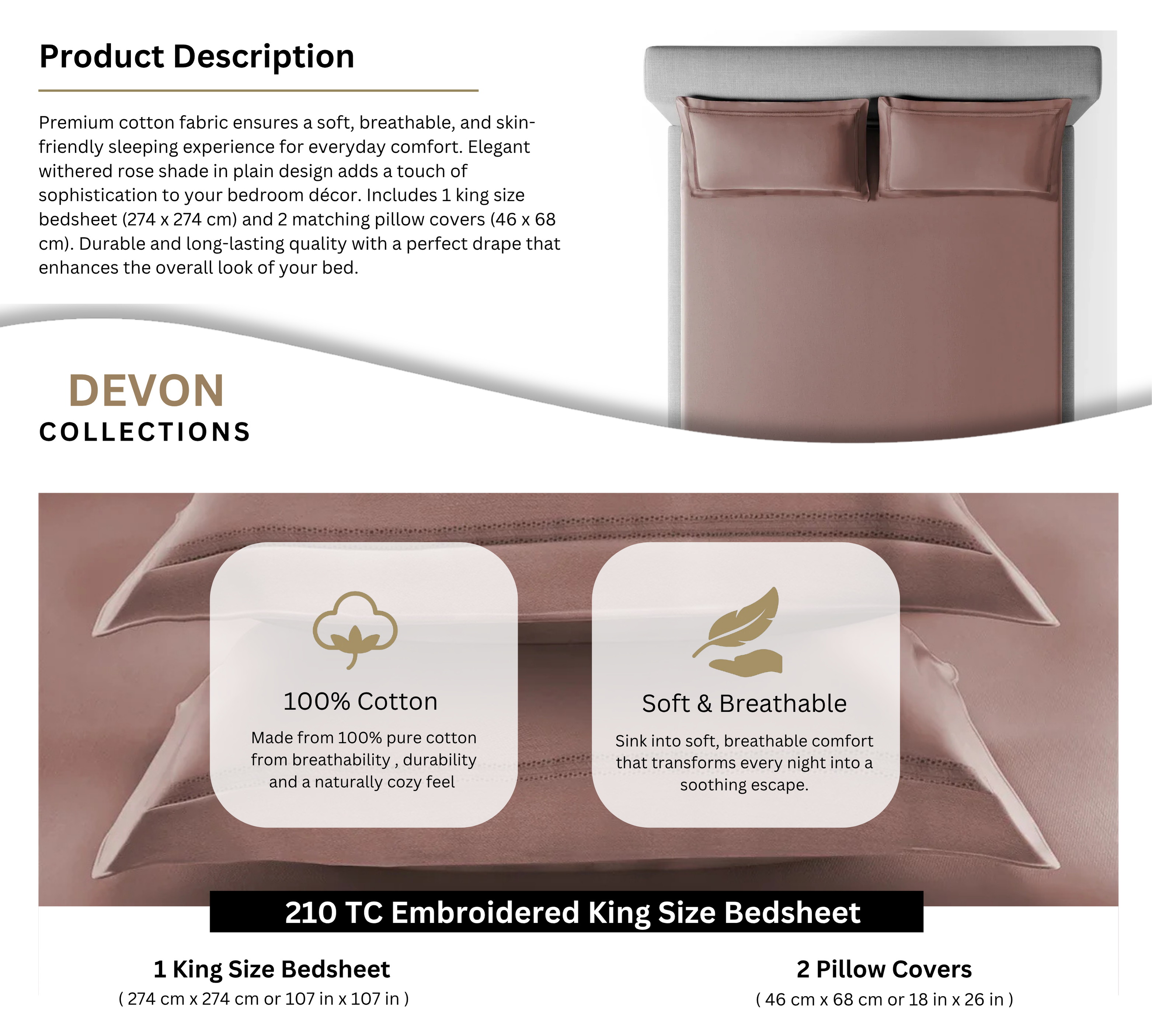 Includes 1 king size bedsheet (274 x 274 cm) and 2 matching pillow covers (46 x 68 cm).