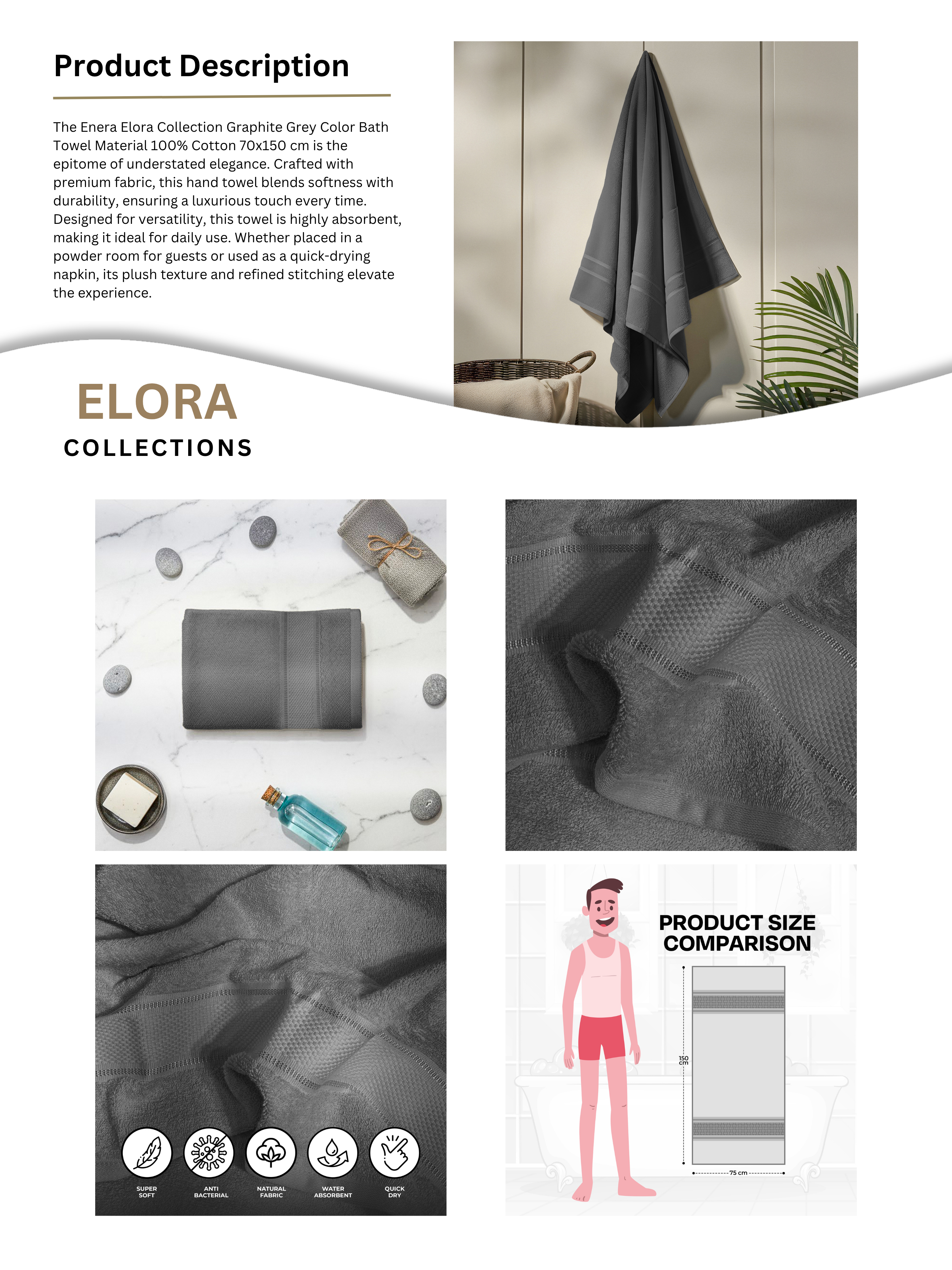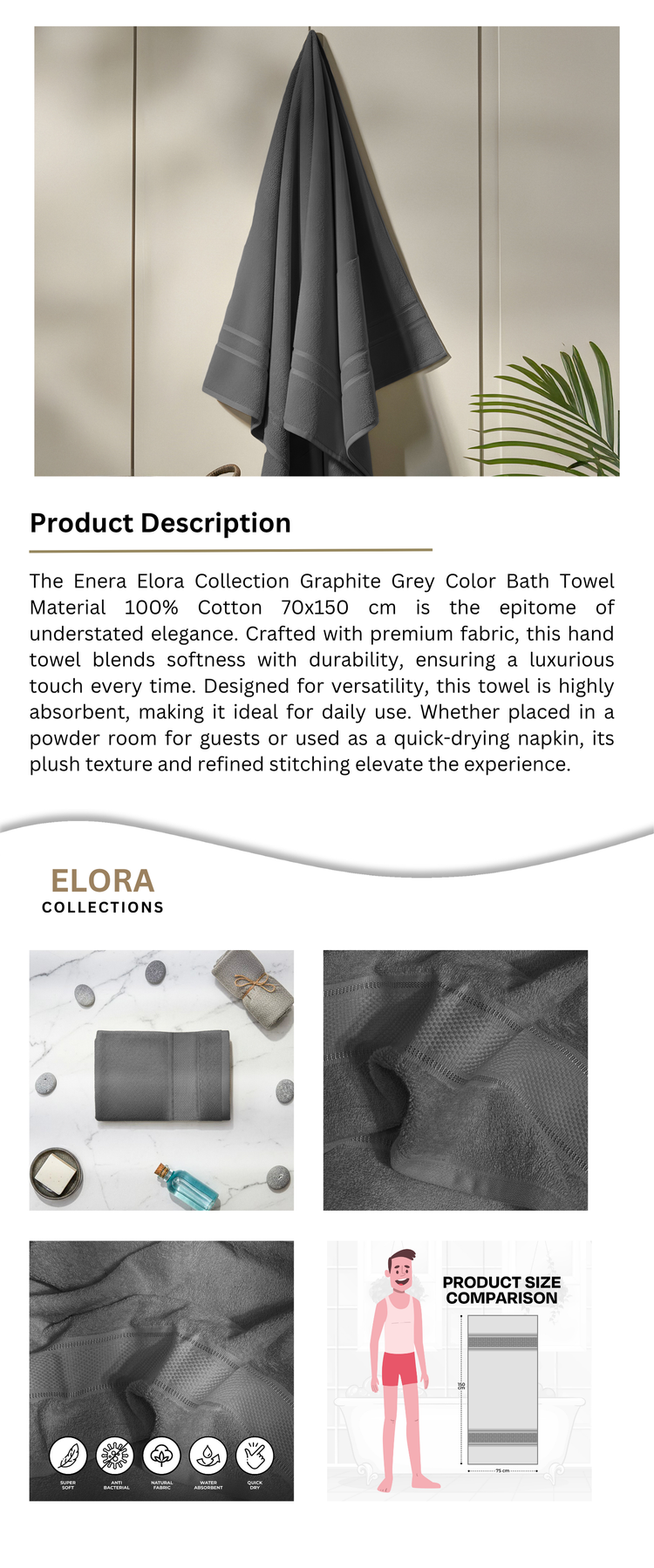 The Enera Elora Collection Graphite Grey Color Bath Towels Material 100% Cotton 70x150 cm is the epitome of understated elegance. Crafted with premium fabric, this hand towel blends softness with durability, ensuring a luxurious touch every time. Designed for versatility, this towel is highly absorbent, making it ideal for daily use. Whether placed in a powder room for guests or used as a quick-drying napkin, its plush texture and refined stitching elevate the experience.