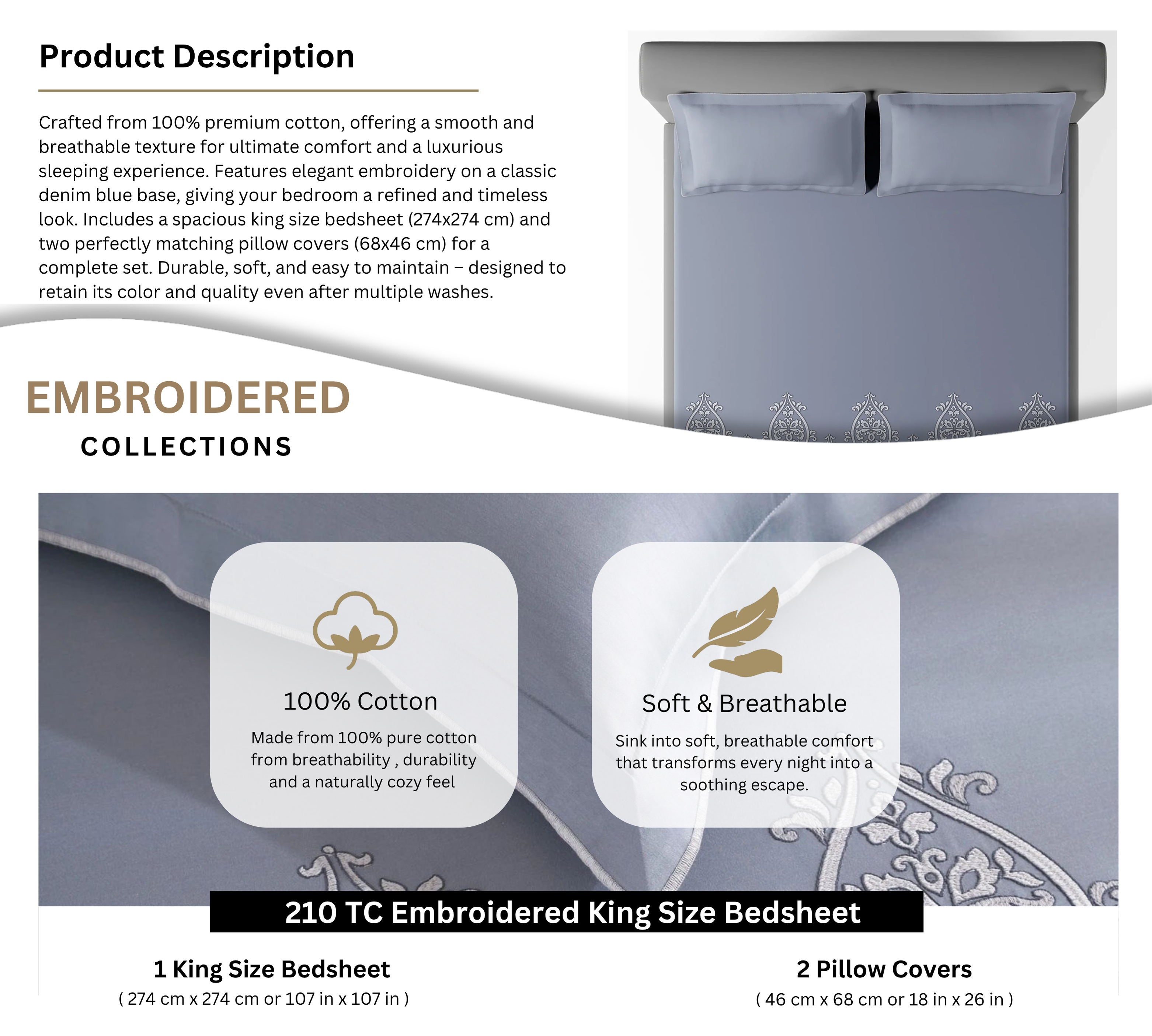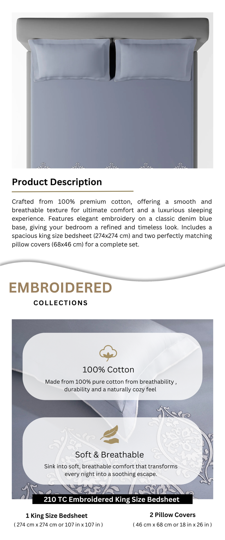 Embroidered Kelstone Denim 100% Cotton King Size Bedsheet Set with 2 Pillow Covers