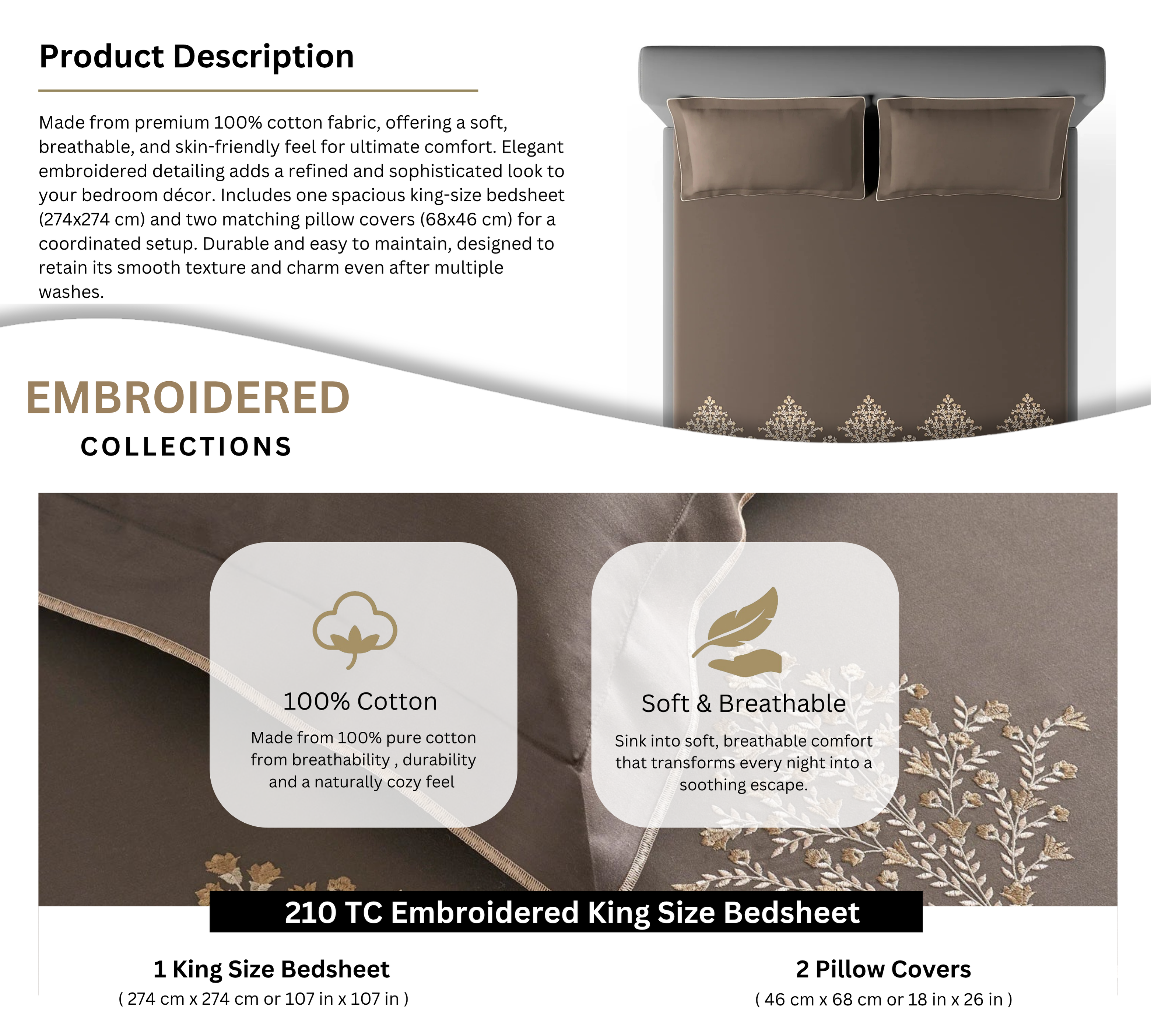 Embroidered Lindley Charcoal 100% Cotton King Size Bedsheet Set with 2 Pillow Covers