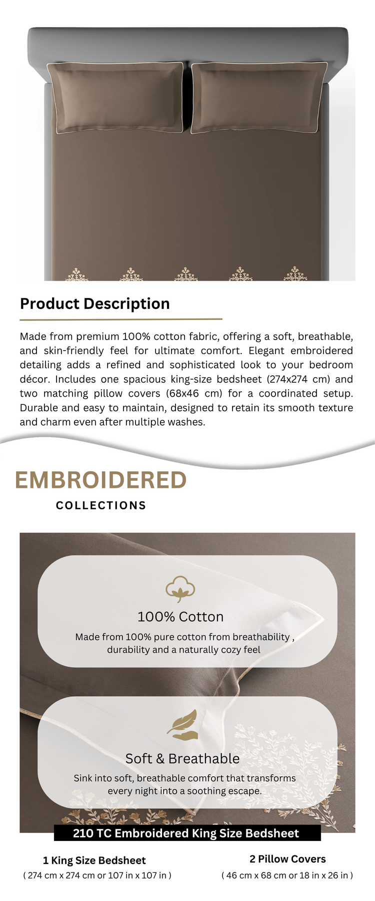 • Includes one spacious king-size bedsheet (274x274 cm) and two matching pillow covers (68x46 cm) for a coordinated setup.