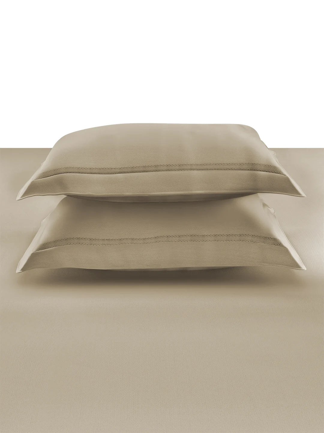 Elegant plain design in oatmeal shade with minimal embroidery detail, adding subtle sophistication to your bedroom décor.